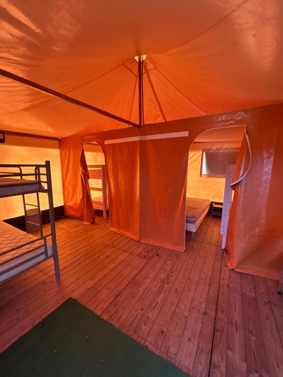 La partie hébergement est composée d'un espace avec une tente équipée de lits d'une capacité de 8 personnes, avec deux chambres.