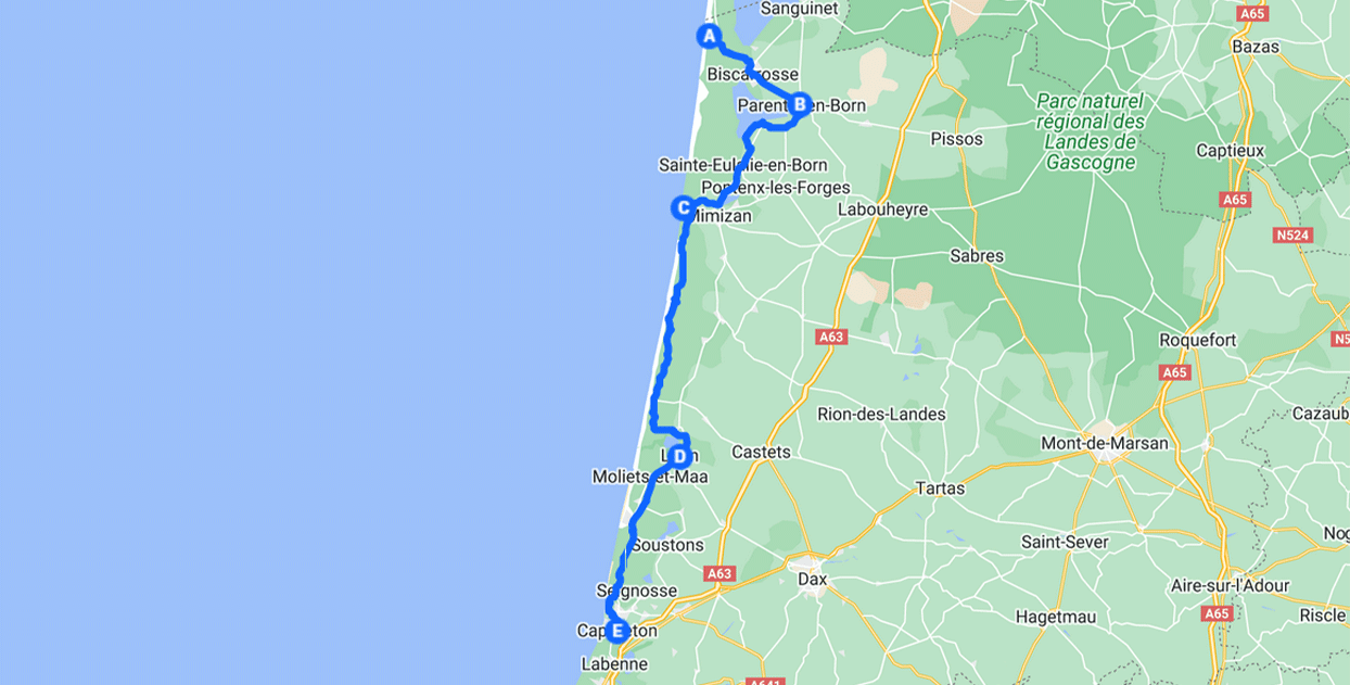 Le départ de l’aventure se fera à Biscarrosse avec une première étape pour faire connaissance et se préparer. Ensuite, dès le jour 2, tu commenceras à pédaler et à découvrir cette magnifique région. 🚴♂️