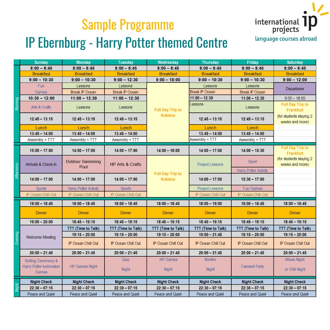 Environnement: - Situé entre des villes historiques comme Francfort, Mayence, Bad Kreuznach et Worms, le petit village sûr d'Ebernburg est parfait pour les jeunes étudiants. - Tu seras logé dans un véritable château médiéval, dans de spacieuses chambres à plusieurs lits avec salle de bains (2 à 5 lits par chambre). Les membres de notre équipe vivent également dans la résidence et sont là pour toi à tout moment, jour et nuit, Autres informations : - Restauration : Pension complète qui comprend un petit-déjeuner continental, un déjeuner à 2 plats et un dîner froid et une option chaude à part. Pour le petit-déjeuner, nous servons du pain (petits pains) et de la confiture, du miel, du fromage et de la charcuterie, de l’eau, du thé et du café, ainsi que quelques céréales. Le déjeuner consiste en un plat principal avec une salade et un dessert. Le dîner est un repas froid avec un compliment chaud. Des options végétariennes sont proposées tous les jours. Des options végétaliennes, sans gluten et sans lactose sont disponibles sur demande.