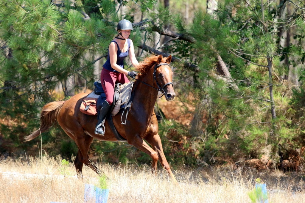 Cavalerie polyvalente, dressée aussi bien pour le travail en carrière, la préparation des galops, et sans surprise en extérieur que ce soit en forêt ou sur la plage.